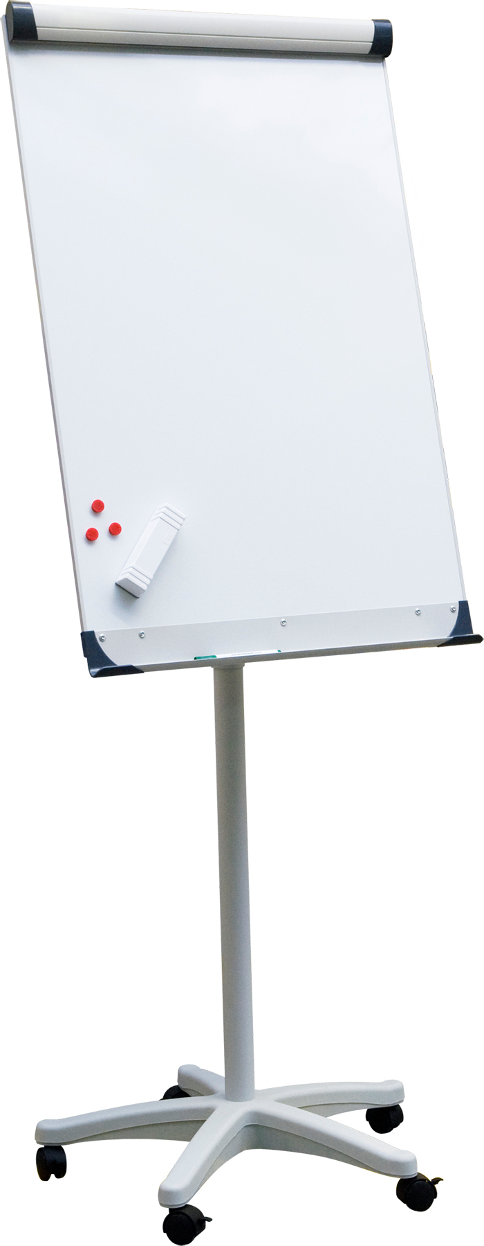 Доска флипчарт на пяти колесах с креплением для листа или блока бумаги, переворачиваемой по принципу блокнота.