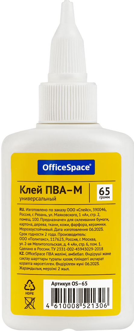 Клей ПВА, 65 гр. с дозатором OfficeSpace