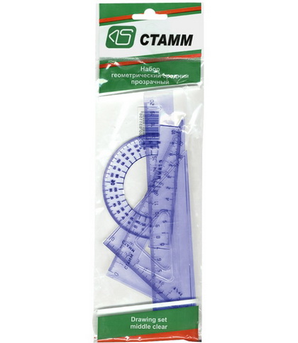 • набор содержит линейку 20см, треугольник 9см 45*, треугольник 13см 30*, транспортир 10см 180*