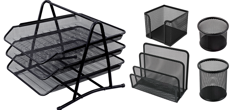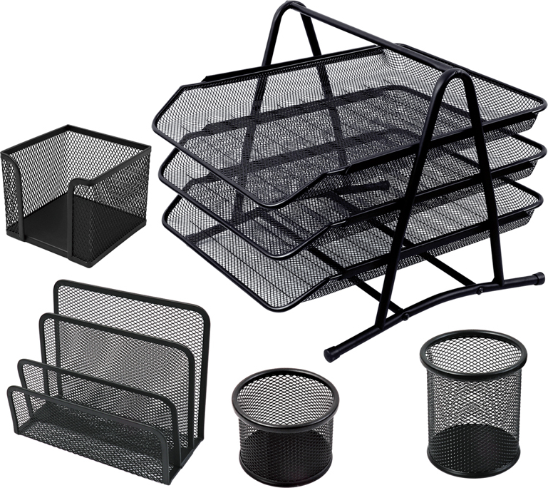Описание продукта: Настольный набор из пяти предметов выполнен из прочного металлического материала, который гарантирует долговечность использования. Сетчатая структура не только стильная, но и практичная, обеспечивая отличный обзор содержимого.