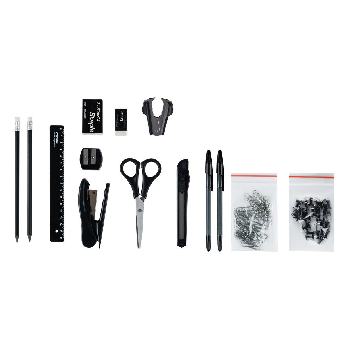 В состав набора входят: 2 шариковые ручки, 2 чернографитных карандаша, степлер для скоб №10, скобы №10, антистеплер, ножницы, канцелярский нож, точилка, ластик, линейка, скрепки 50 шт. и кнопки 30 шт.