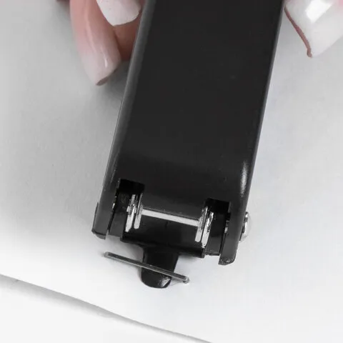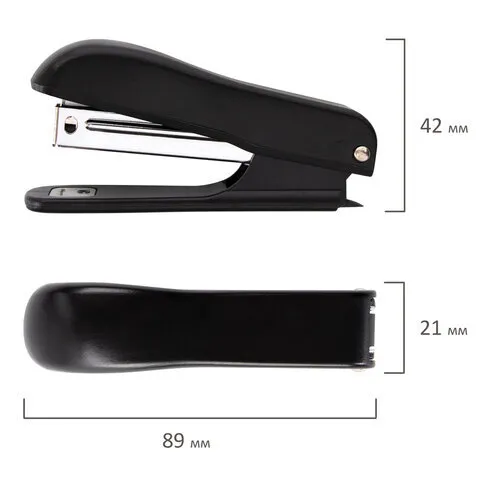 Степлер STAFF "Basic" с антистеплером в черном эргономичном пластиковом корпусе с металлическим механизмом cпособен скрепить до 12 листов. Подходящий размер скоб № 10. Виды сшивания: закрытый. Глубина закладки бумаги - 49 мм. Габариты: высота - 42 мм, ширина - 21 мм, длина - 89 мм.