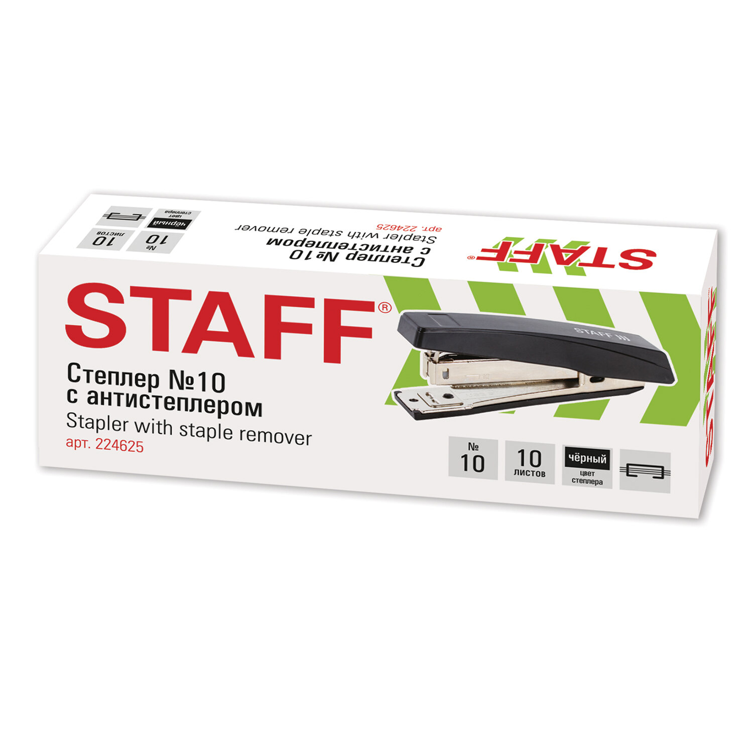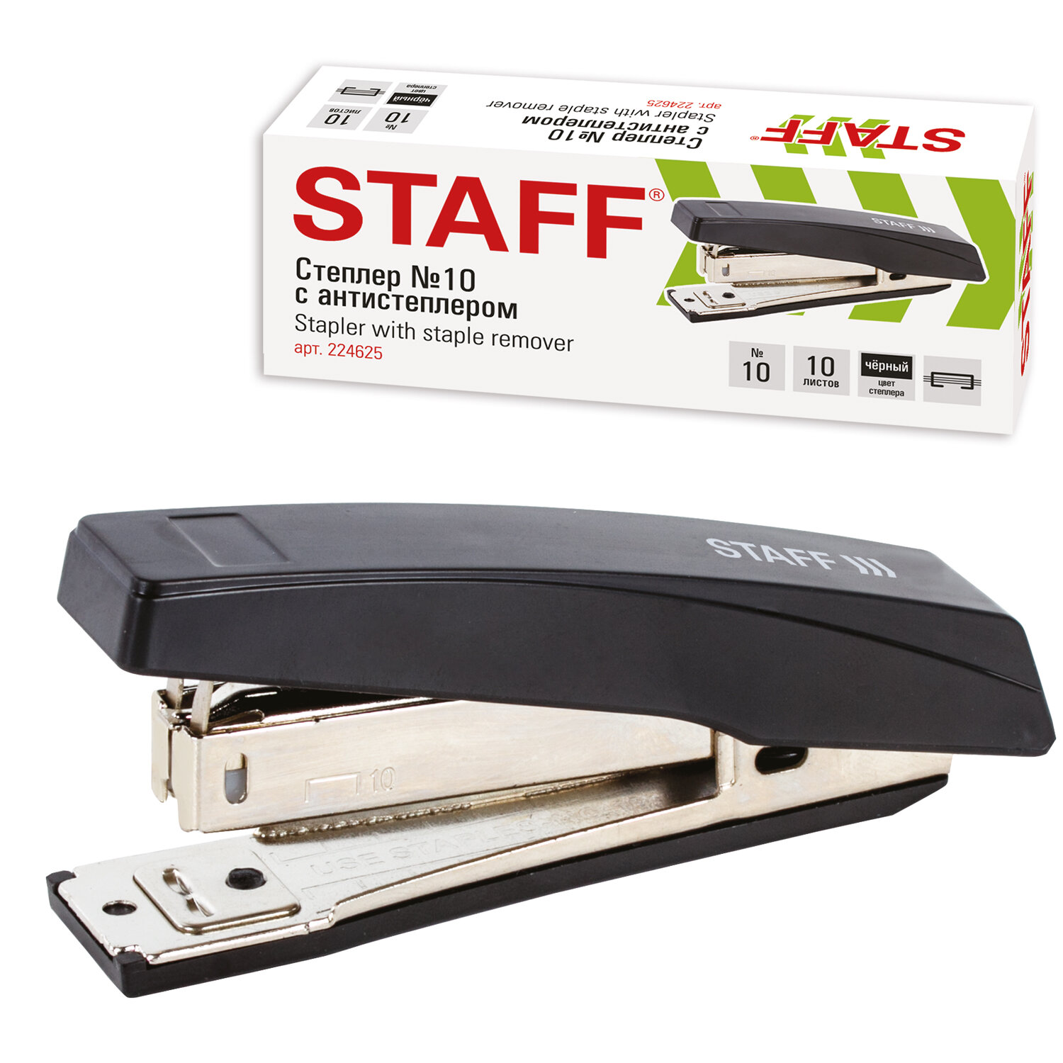 Настольный степлер STAFF с антистеплером в черном пластиковом корпусе с металлическим механизмом cпособен скрепить до 10 листов.