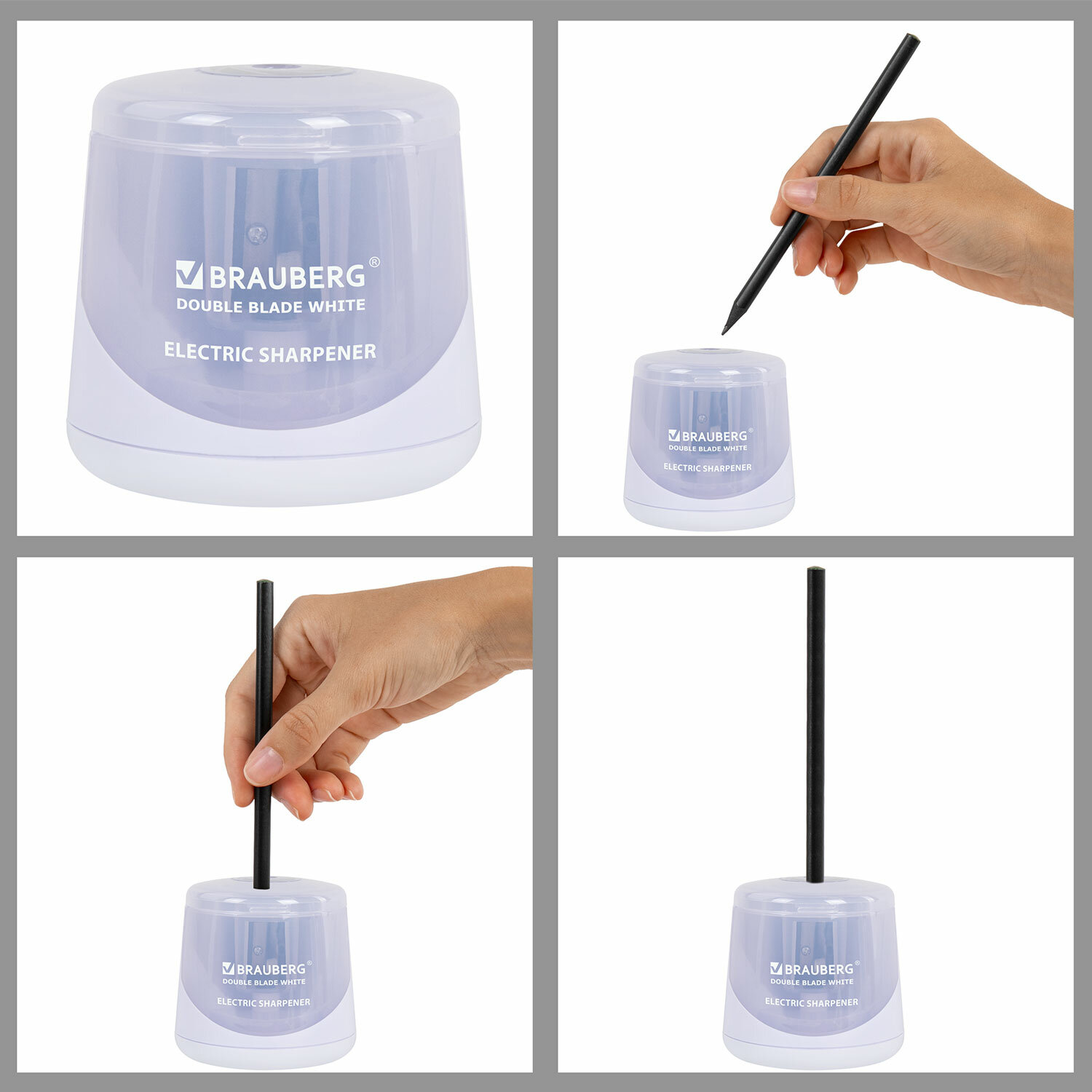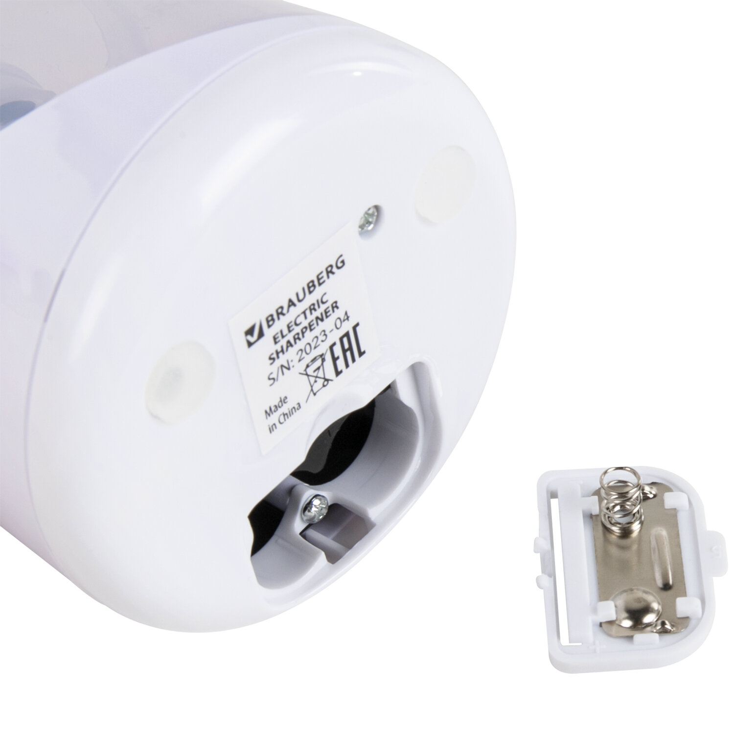 Электрическая точилка BRAUBERG DOUBLE BLADE WHITE с контейнером для сбора стружки и прямым двойным лезвием работает от 2 батареек АА (в комплект не входят).