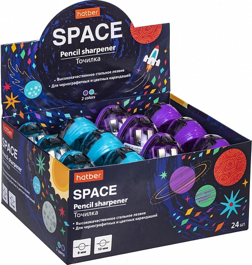 Точилка 2 отверстия, с контейнером, пластик "Hatber Space" 8мм корпус ассорти