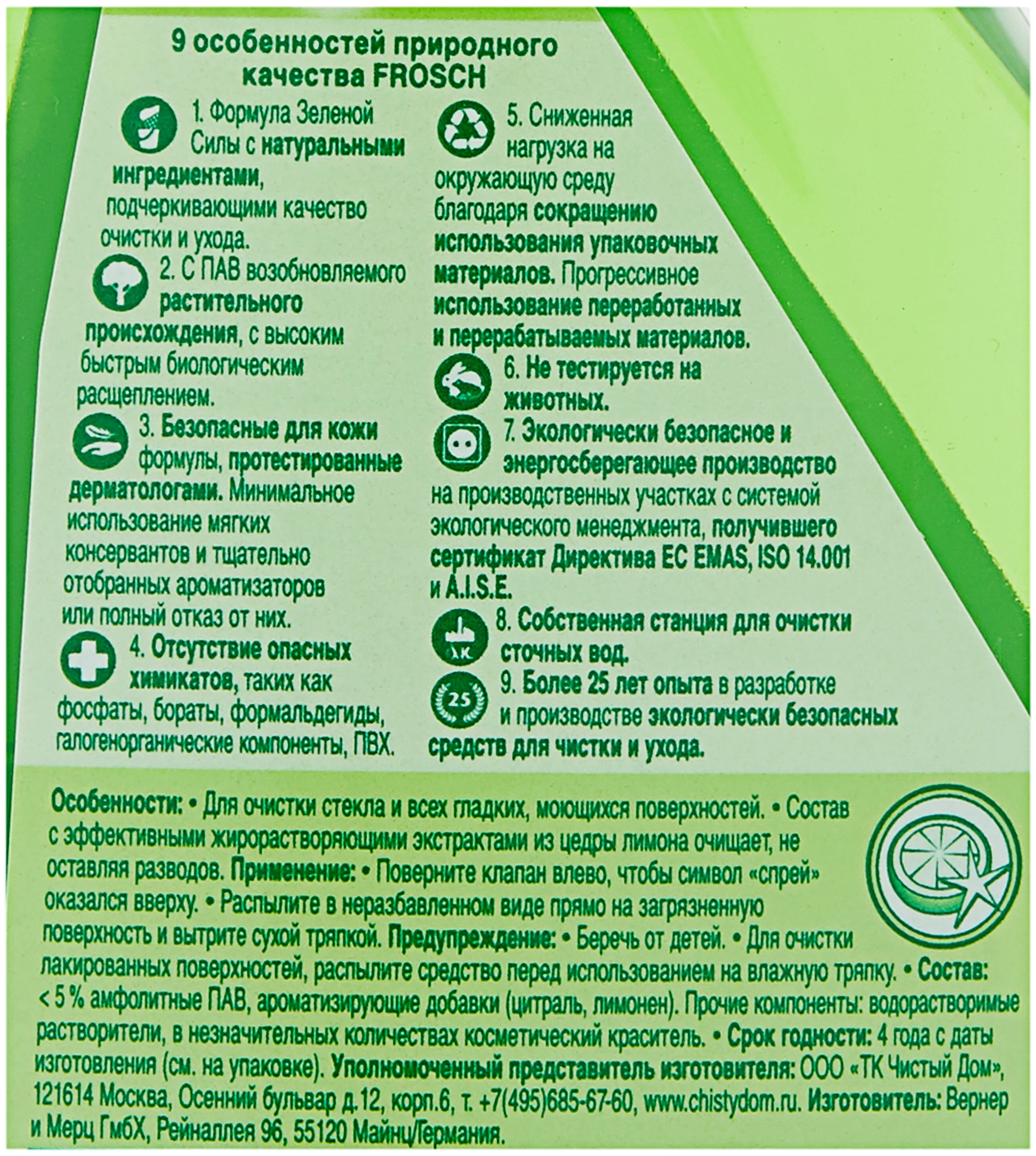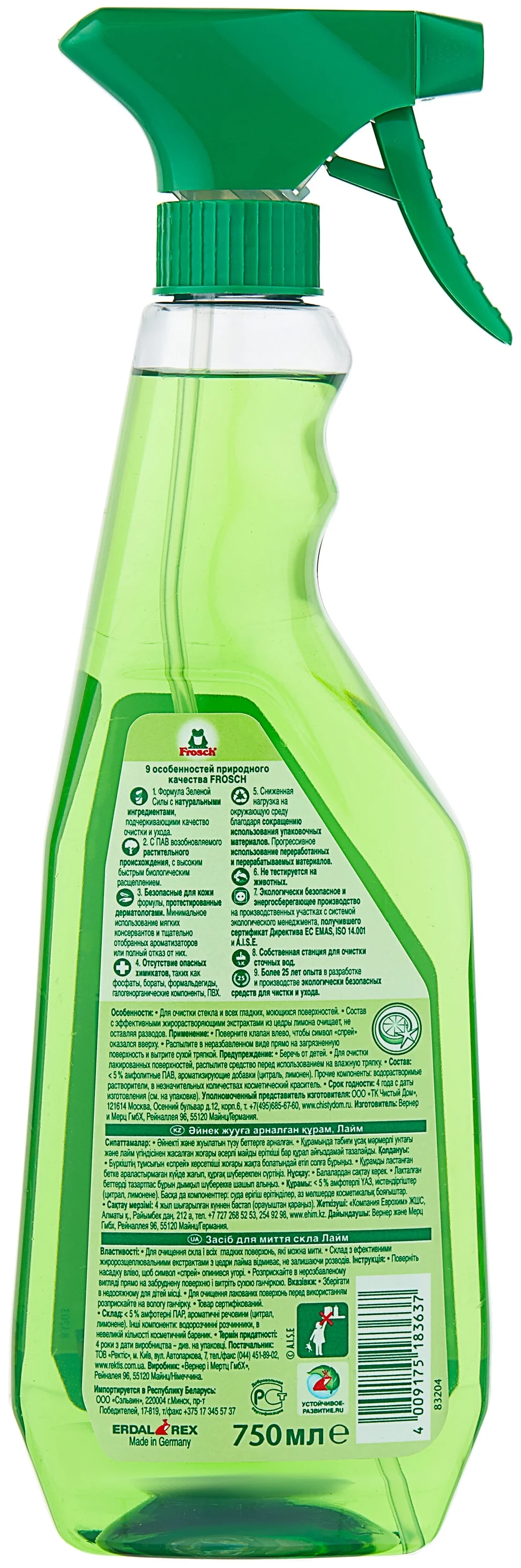 Средство для мытья стекол и поверхностей, 750мл, с триггером, "Frosch" лимон