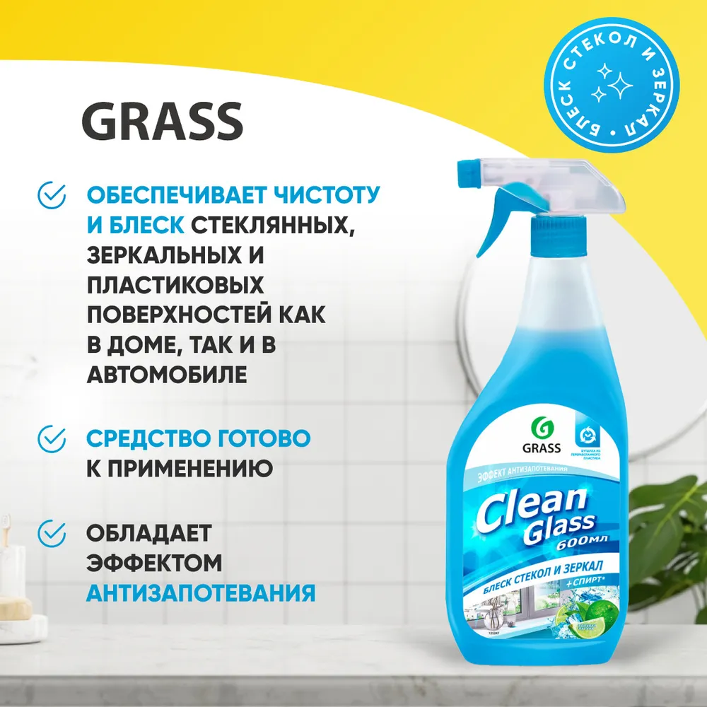 Спрей для уборки дома Clean Glass GRASS предотвращает запотевание стекол и образование конденсата.