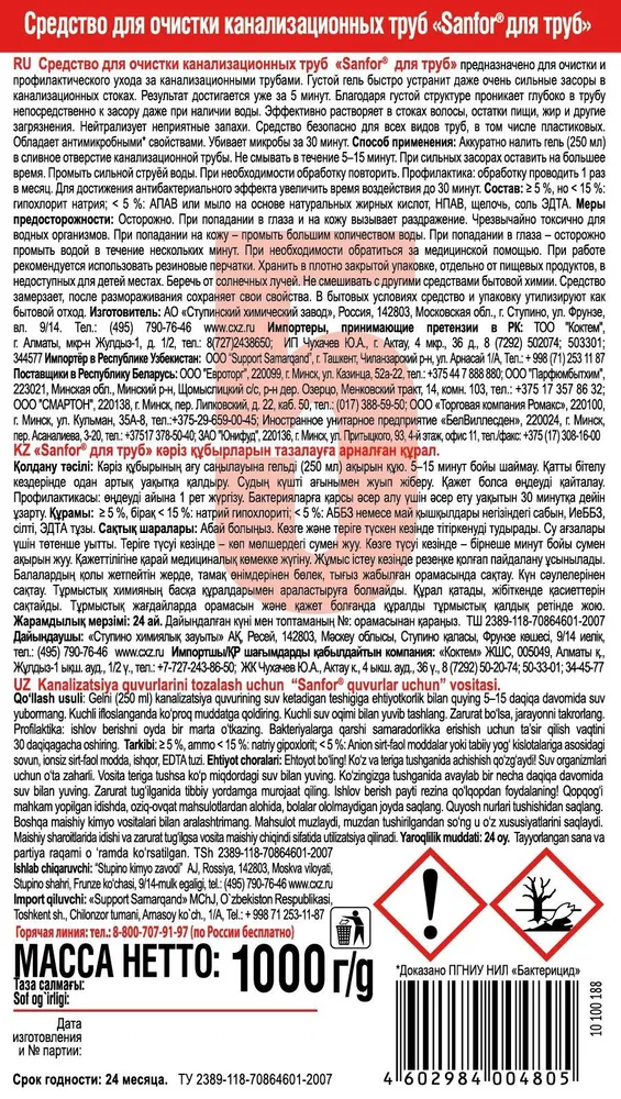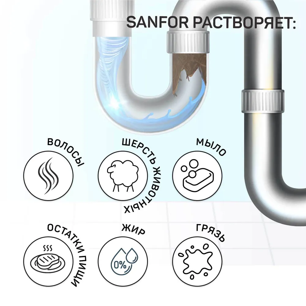Sanfor это надежное средство - антизасор, волосогон для вашей кухни и ванной. Он позволяет избежать дорогостоящего вызова сантехника и решает проблему засоров самостоятельно. Безопасная для любой пластиковой сантехники бытовая химия для дома быстро растворит волосы, шерсть животных, мыло, остатки жира и грязь.