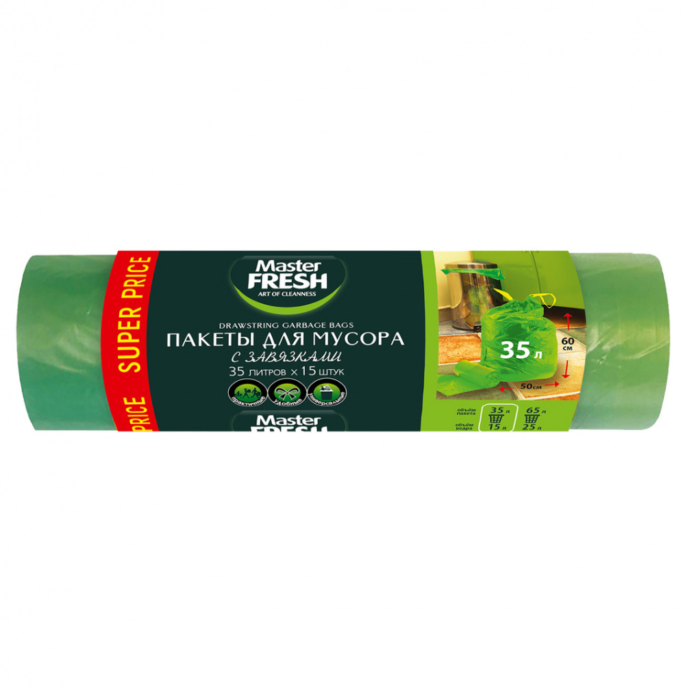 Пакет для мусора на 35л с затяжкой, 15шт, зеленый Master Fresh