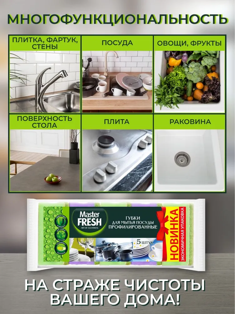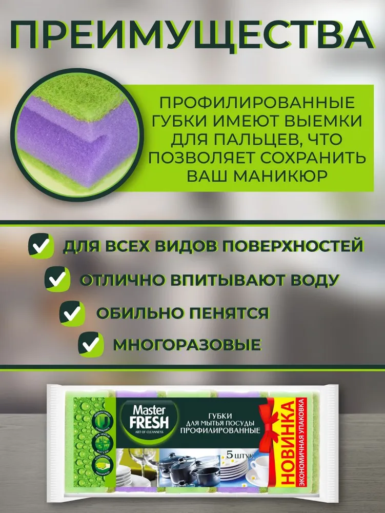 Губка для мытья посуды 5 шт в уп. профилированные, "Master Fresh"
