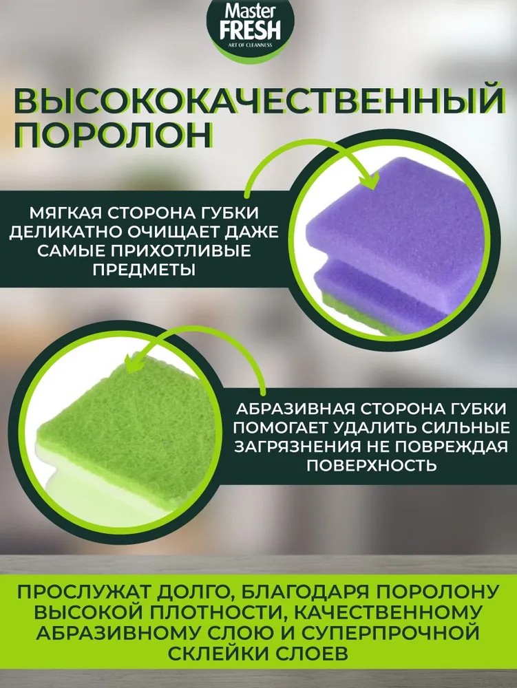 Губки для мытья посуды от торговой марки Master Fresh сделаны из крупнопористого поролона повышенной прочности, что обеспечивает повышенное пенообразование.