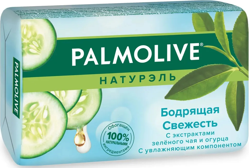 Туалетное мыло Palmolive Натурэль Бодрящая Свежесть с экстрактами зеленого чая и огурца обогащено 100% натуральными ингредиентами. Огурец способствует смягчению и увлажнению кожи, делая ее мягкой и шелковистой.