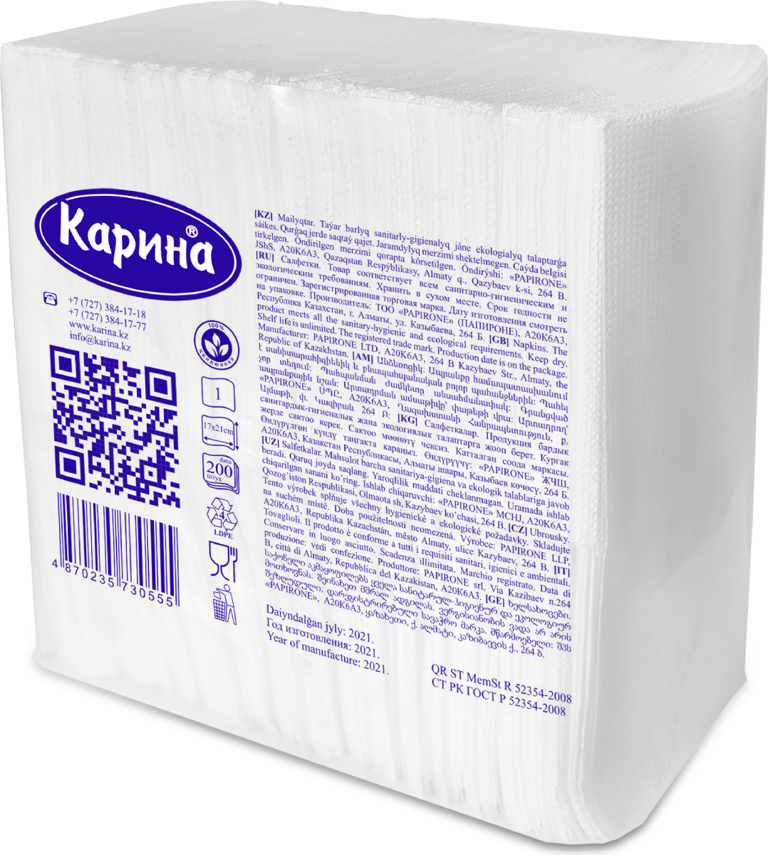 Размер салфетки: 170х210 мм, количество в упаковке: 200 шт.