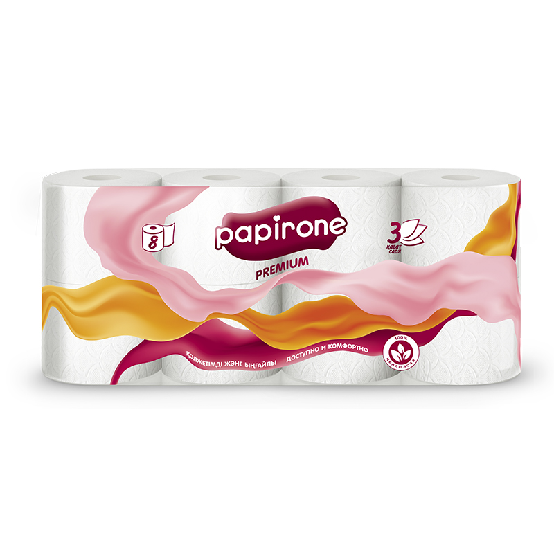 Бумага туалетная 3х-слойная, "Papirone Premium" со втулкой, без обертки 8 шт в уп