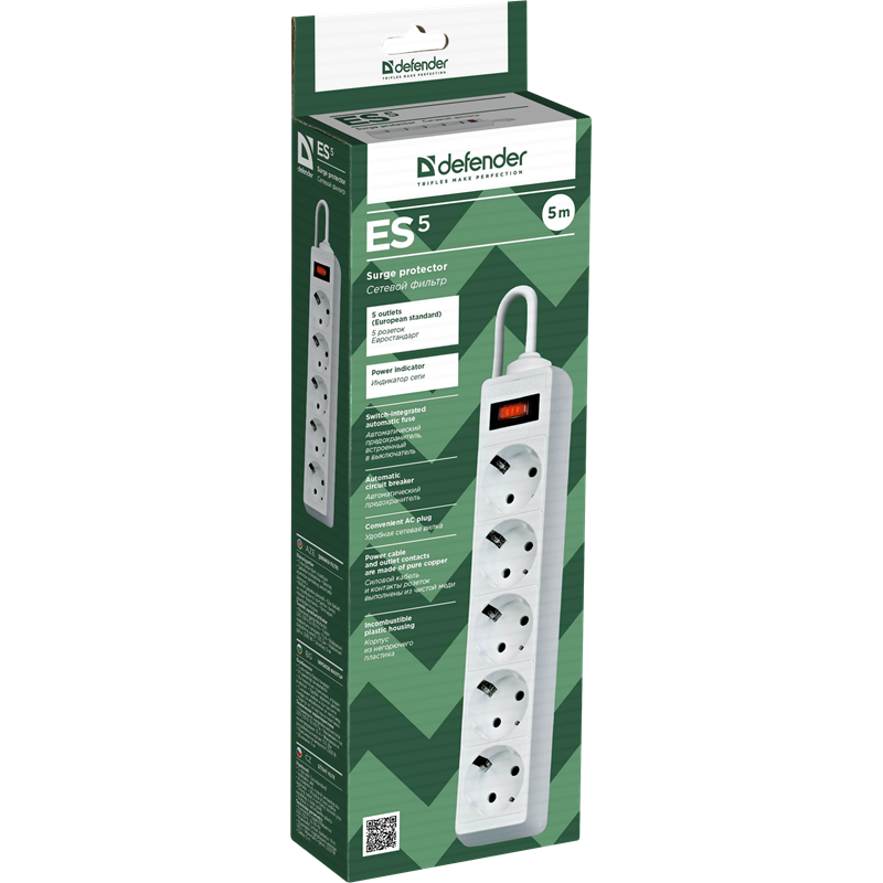 Сетевой фильтр 5 гнезд, 5 м, Defender ES 5.0, белый