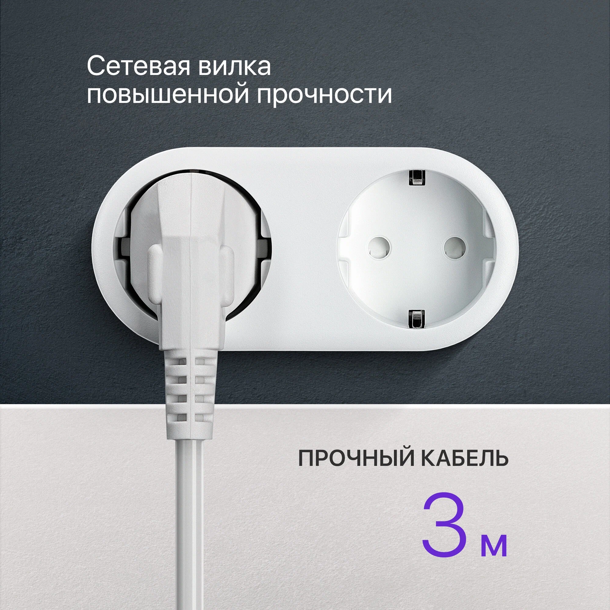 Удлинитель имеет корпус из негорючего пластика и прочный провод длиной 3 метра.