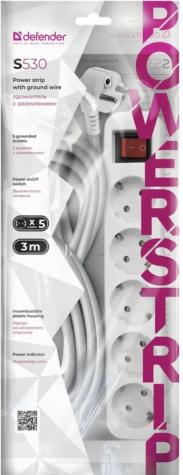 Удлинитель Defender S530 - это электроудлинитель, оснащенный 5 розетками с заземлением и выключателем.