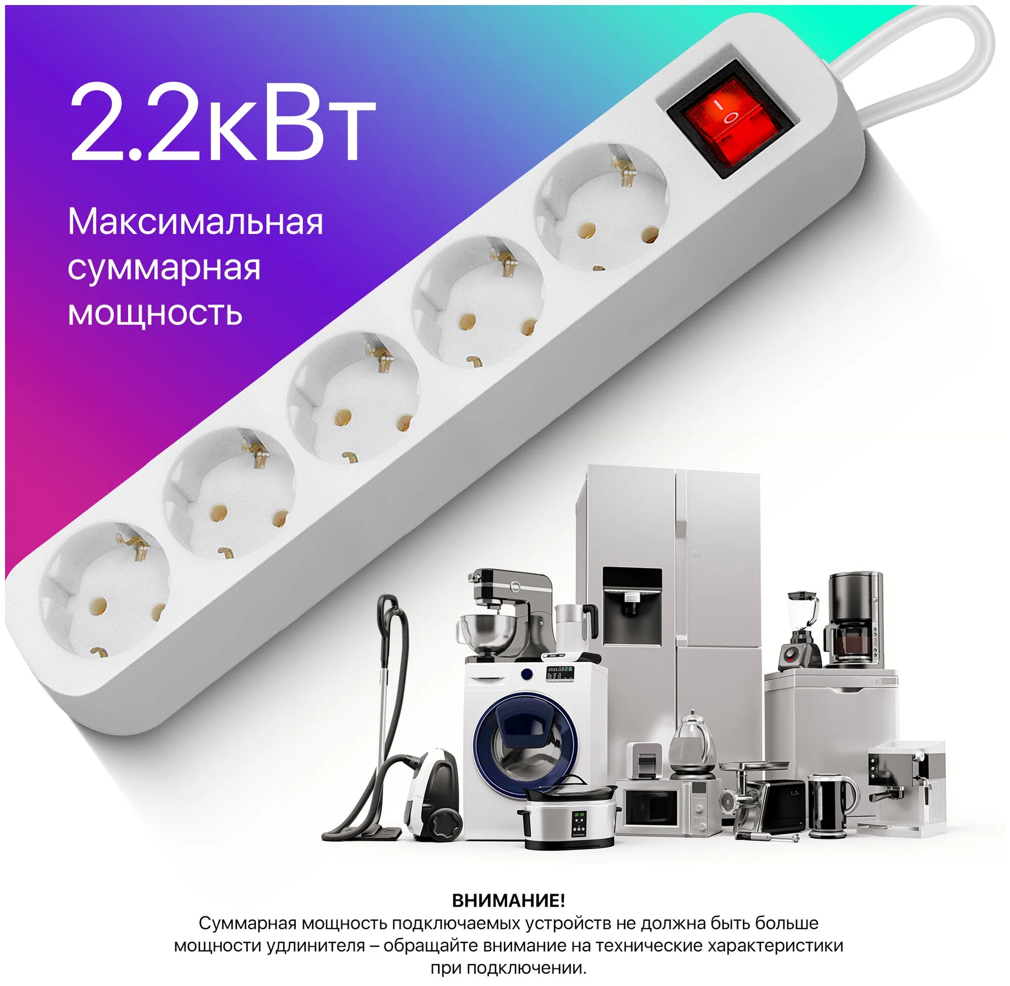 - Максимальная суммарная мощность нагрузки: 2200 Вт