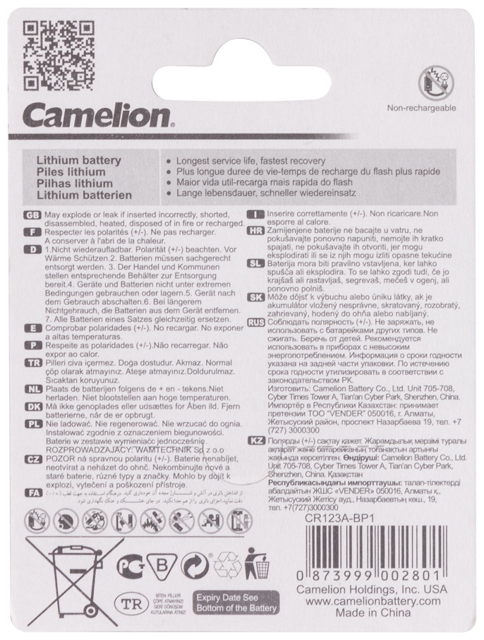 Элемент питания Camelion CR123A имеет высокую емкость, долгий срок эксплуатации в широком диапазоне температур и высокое качество изготовления.
