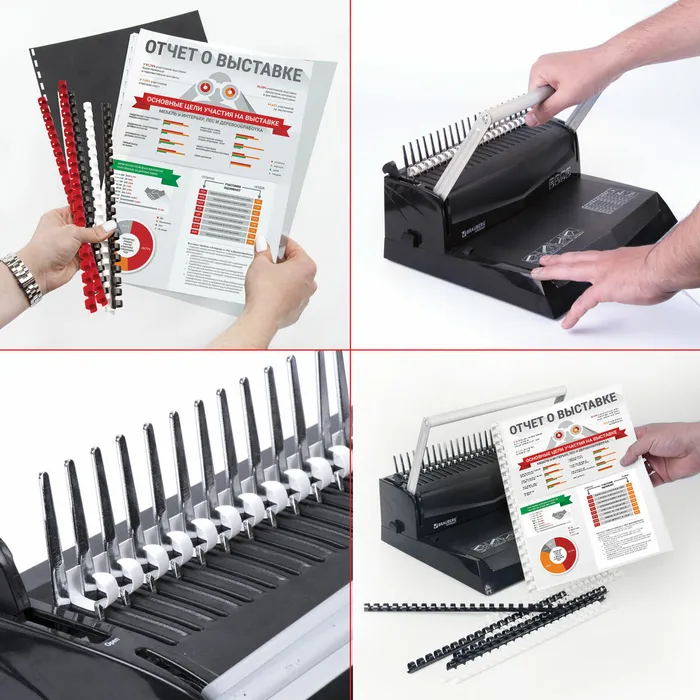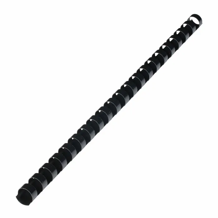 Рекомендуется использовать для переплета документов объемом от 56 до 80 листов. Изготовлена из высококачественного пластика чёрного цвета. Состоит из 21 кольца диаметром 12 мм. В упаковке 100 штук.