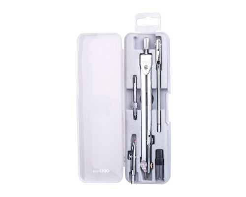 Комплектация: циркуль с игольчатой вставкой, карандашная вставка, рейсфедер, удлинитель, запасные грифели HB, диаметром 2 мм.
