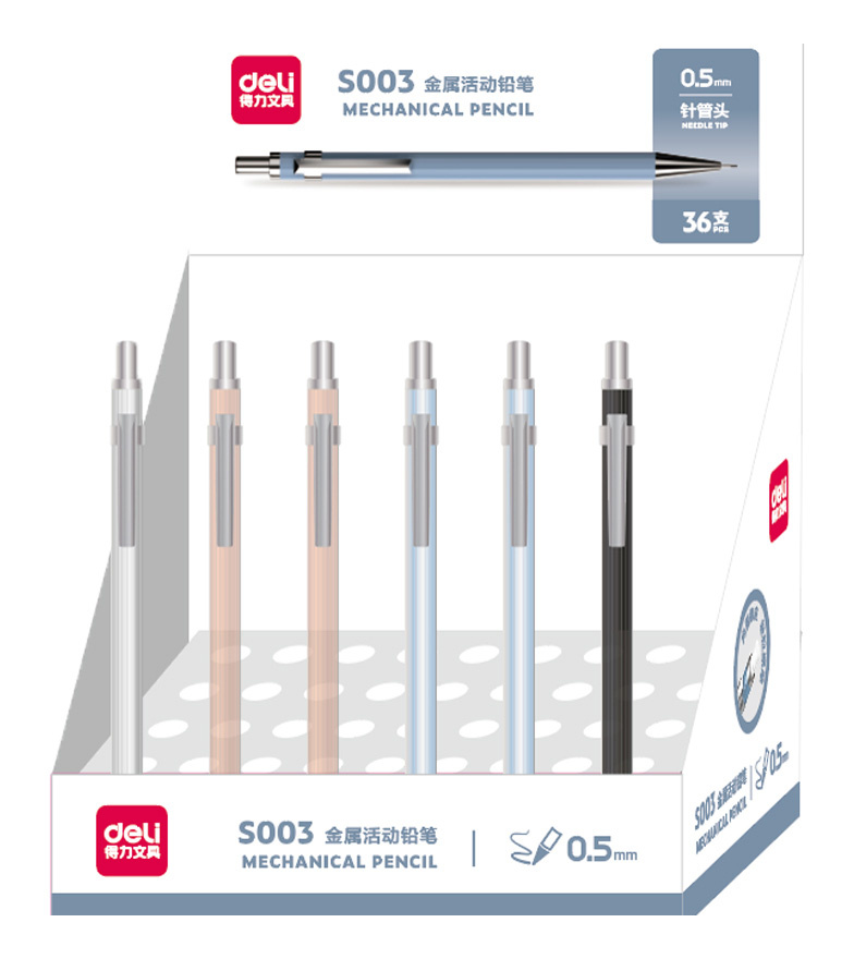 Механический карандаш Deli с металлическим клипом и хромированным элементами.