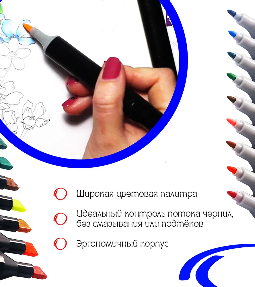 Набор двухсторонних скетч-маркеров, которые помогут реализовать любые творческие или дизайнерские замыслы, создать скетчи, эскизы, манга, комиксы, иллюстрации и многое другое.