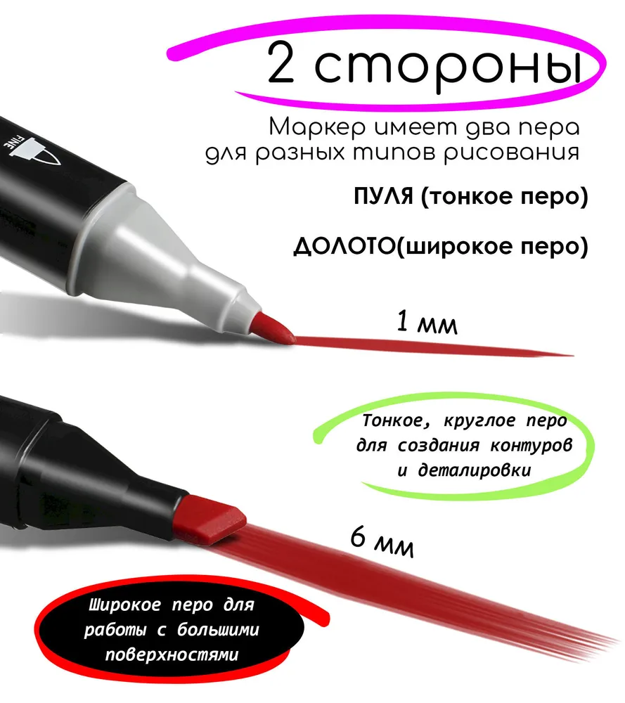 Идеальный инструмент как для новичков, так и для профессионалов. Скетч-маркеры с функциональным дизайном имеют две рабочие стороны: