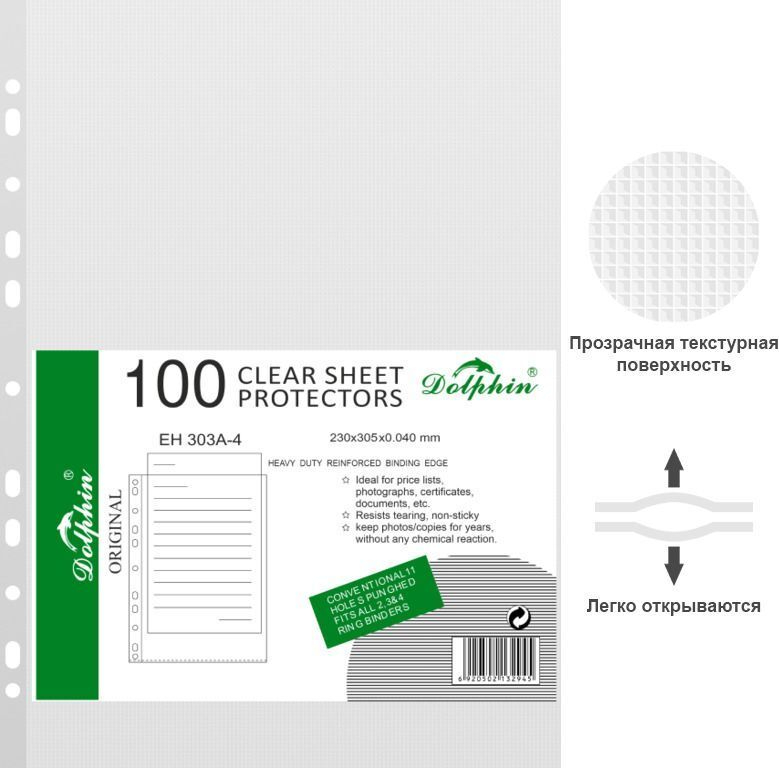 Прозрачные файлы-вкладыши Dolphin формата А4 - это практичное решение для хранения и защиты важных документов. Изготовленные из высококачественной полипропиленовой пленки плотностью 0,040 мм, они обеспечивают надежную сохранность бумаг.