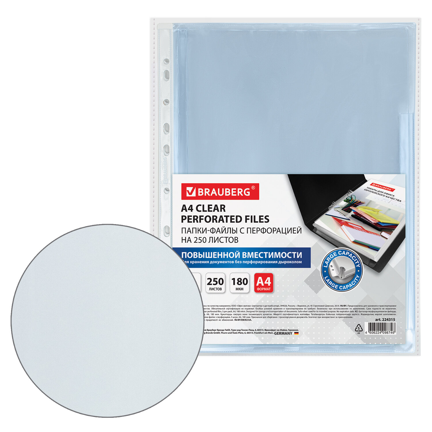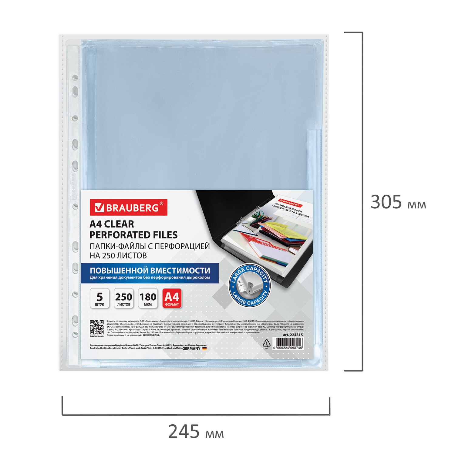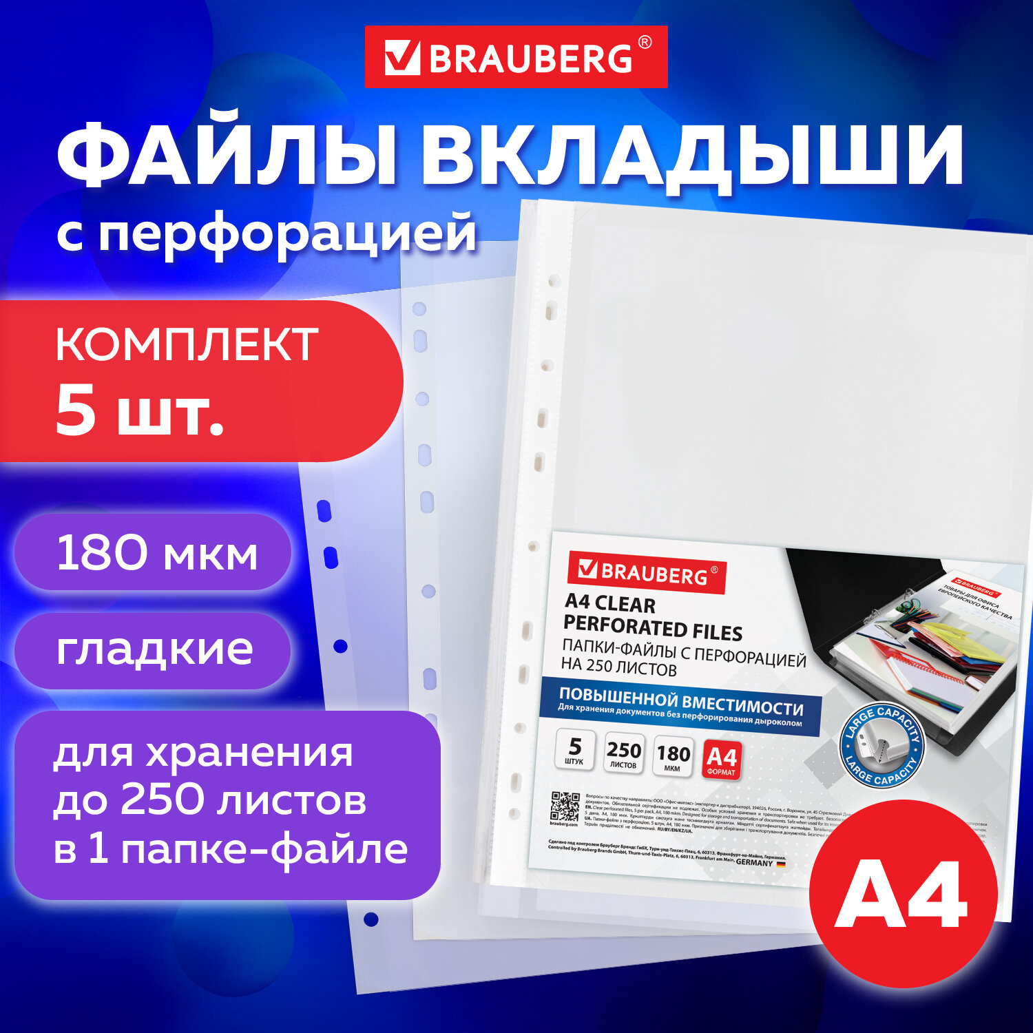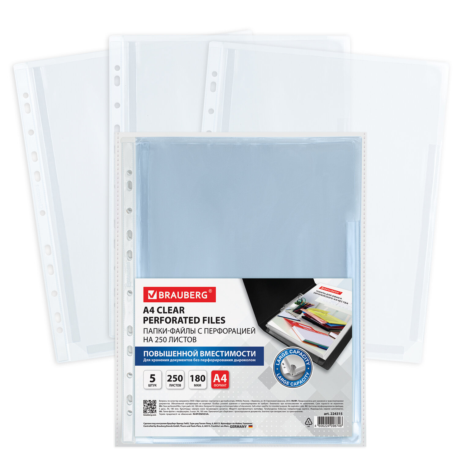Файл прозрачный, А4, объемный, до 250л., 180мкм Brauberg, 5 шт.в уп