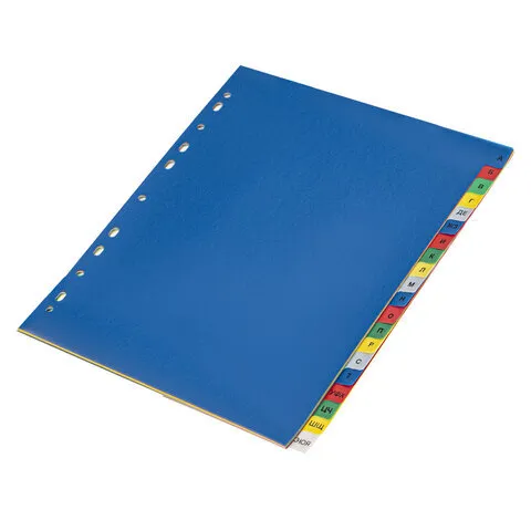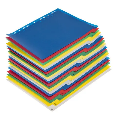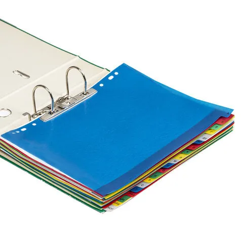 В комплект входят 20 листов синего, красного, серого, зеленого и желтого цвета, обеспечивающих возможность сортировки документов по алфавиту, а также титульный лист для оглавления. Универсальная перфорация позволяет подшивать разделители во все типы папок.