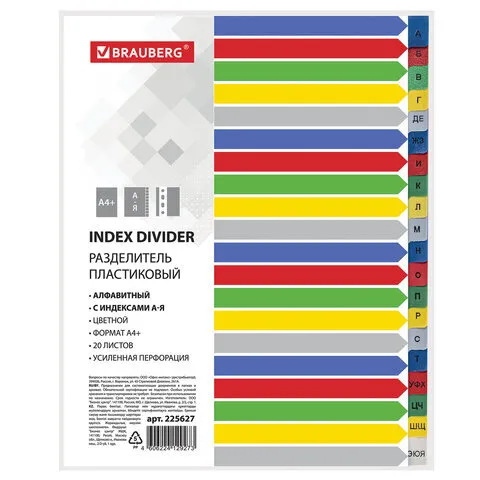 Разделитель А-Я, А4, 20л, пластиковый, цветной Brauberg