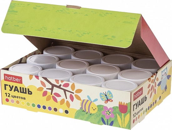 Благодаря плотно закрывающимся крышкам гуашь долго сохраняет свои свойства. Упаковка: картонная коробка с фиксирующим клапаном.